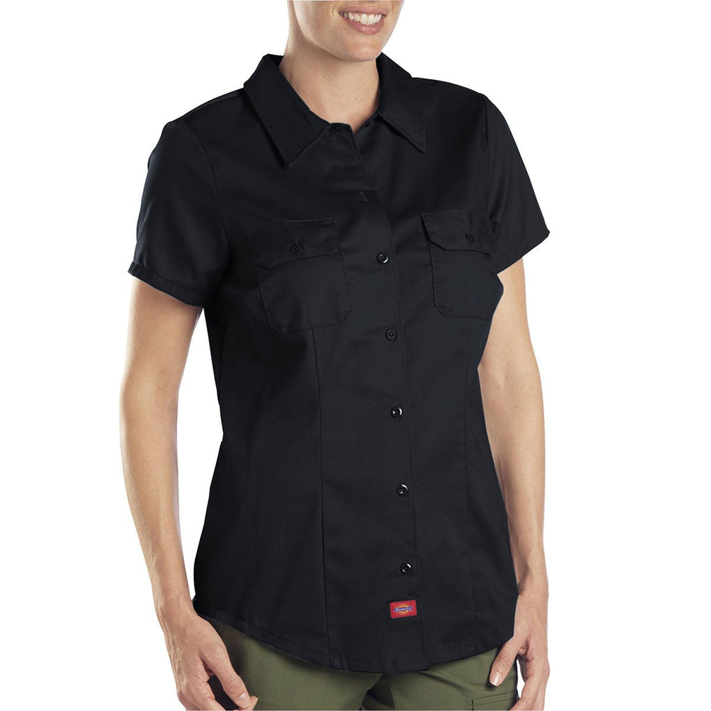 Dickies is certainly a top name in working apparel and your custom logo will seem right at home embroidered on this Dickies Women's Black 5.25 Oz. Women's Twill Shirt. There are so many features that are indicative of the Dickies quality. Washing and wearing is made easier with the addition of the Visa moisture-wicking and stain-release finish. The fit is outstanding thanks to front darts. This shirt also features a banded collar with top stitching, two chest pockets, 20-line melamine buttons and the classic Dickies logo patch at the bottom of the placket. Sizes are S to XL in your choice of black, dark navy, graphite and khaki.Corresponding Men's Style: Dickies Men's Black 5.25 oz. Short-Sleeve Work Shirt
