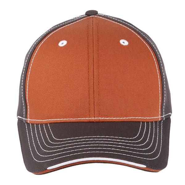 The brilliant look of this Paramount Apparel Burnt Orange/Charcoal Cotton Twill Cap provides you with several special features for display. This comes with a contrasting sandwich color with a two-color design on the front that will complement your custom logo well. The contrast stitching feature adds a good tone that blends in well with the colors. This can work well with many great corporate logo designs. This is nice for when you have a company logo that you want to show off while using more detail on the body of the hat. This is also useful for when you need to have a hat that is light for wear on a baseball diamond, what with the cotton twill surface offering a soft tone.