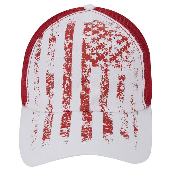 The Paramount Apparel White/Dark Red Patriotic Mesh Back Cap is certainly something worth saluting. The hat offers a faded American flag appearance that hangs accordingly with some of the stripes spreading out over the bill. The screened pattern, like the colors on the flag, will not run. The heavy enzyme wash also produces the naturally weathered style that makes it a popular choice for wear. The cotton twill body also adds a good style while the mesh back keeps it strong. This works well for many special events and is great for veterans' groups to gift out; this can even be paired with a logo if desired.Highlights