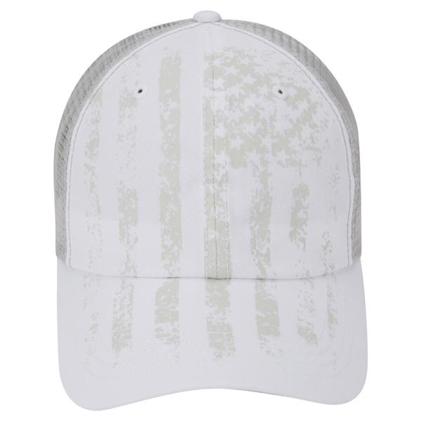 The Paramount Apparel White/Grey Patriotic Mesh Back Cap is certainly something worth saluting. The hat offers a faded American flag appearance that hangs accordingly with some of the stripes spreading out over the bill. The screened pattern, like the colors on the flag, will not run. The heavy enzyme wash also produces the naturally weathered style that makes it a popular choice for wear. The cotton twill body also adds a good style while the mesh back keeps it strong. This works well for many special events and is great for veterans' groups to gift out; this can even be paired with a logo if desired.