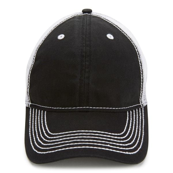 The weathered style of the Paramount Apparel Black/White Heavy Washed Cap produces a fun canvas to feature your company's custom logo on. The fun look features a white mesh surface with a cotton twill front and a fashionable heavy wash texture. This creates a worn look that shows just how active you are and that you have been working well to take care of all your tasks on the job. It is nice for wear in a garage or maintenance field, but it can also be useful as a gift for people who want something that looks natural and simple. The support for an added logo on the front helps too.Highlights