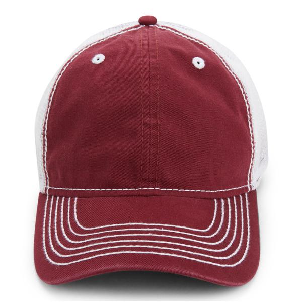 The weathered style of the Paramount Apparel Maroon/White Heavy Washed Cap produces a fun canvas to feature your company's custom logo on. The fun look features a white mesh surface with a cotton twill front and a fashionable heavy wash texture. This creates a worn look that shows just how active you are and that you have been working well to take care of all your tasks on the job. It is nice for wear in a garage or maintenance field, but it can also be useful as a gift for people who want something that looks natural and simple. The support for an added logo on the front helps too.