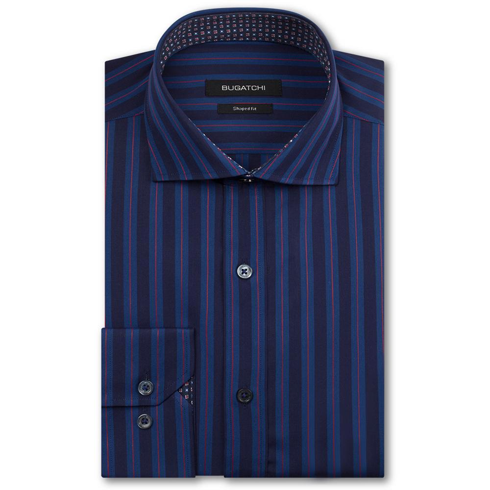 Bugatchi Men's Vertical Stripe Navy Spread Collar Regular Placket No Pocket Long Sleeve Shaped Fit