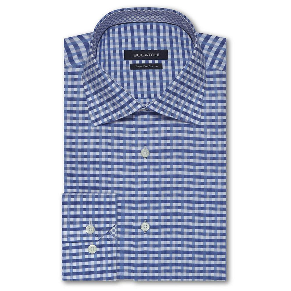 Bugatchi Men's Checker Classic Blue Long Sleeve Point Collar French Placket No Pocket