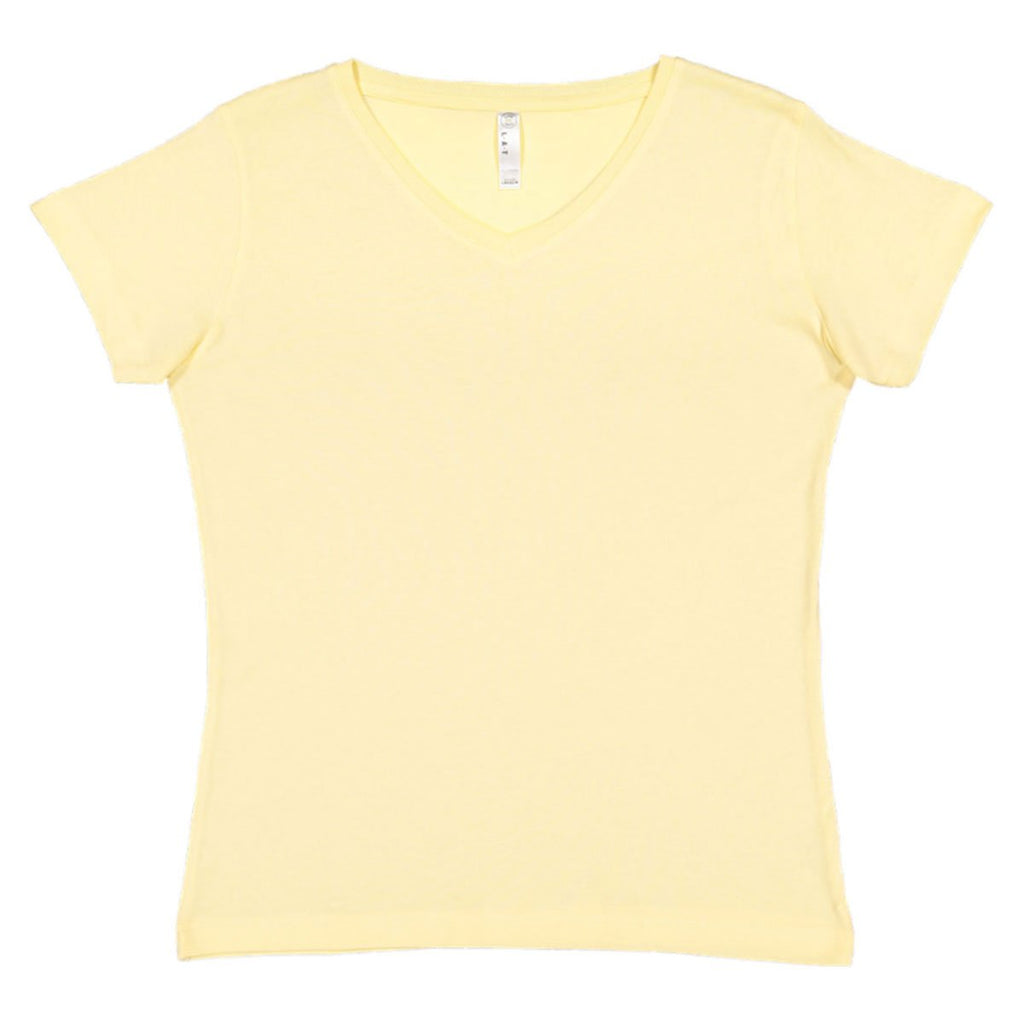 Surprise your employees at the next company event by giving away these LAT Women's Banana V-Neck Premium Jersey T-Shirt, printed with your custom logo. The premium cotton fabric is combined with a small amount of polyester for added reinforcement and ultimate comfort. The sleeves end right above the elbows, while the V-neck layout creates a strong frame for a woman to show off. With an assortment of colors to choose from, this shirt will complement your brand's logo well. Order a supply of these shirts to give away as employee appreciation gifts or use them at recruiting events. Either way, combined with your logo, these shirts are the perfect way to market your brand outside of the office.Highlights