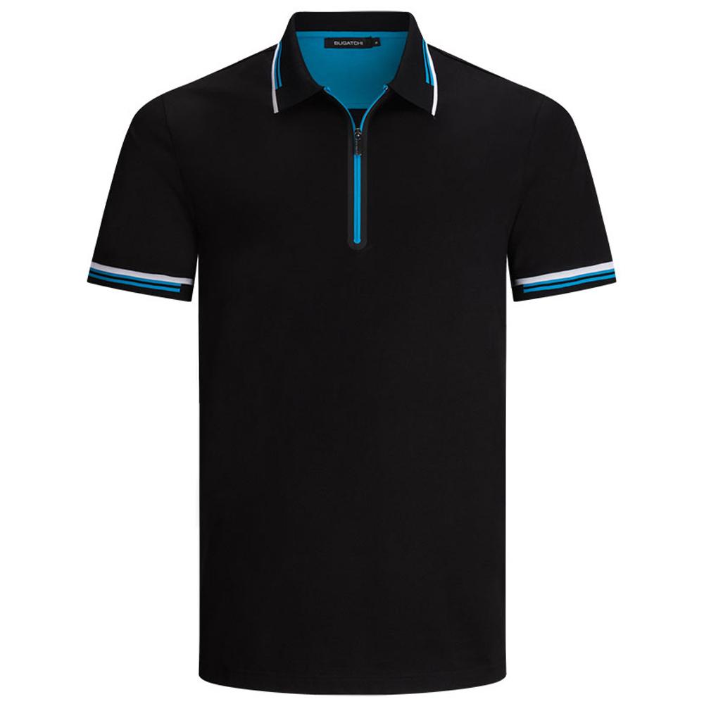 Be stylish with a custom designer look in the Bugatchi Men's Blue Black Short Sleeve Half Zip Polo Collar. The solid color with accent collar and sleeve cuffs will carry your company logo with precision and flair as you wear this as corporate apparel that easily transitions to the golf course. Excellent for layering with a jacket or sweater, the short sleeve polo offers a half zip design for that little bit of extra. Choose your embroidery design and use these as high end gifts of employee apparel or even employee gifts for any special occasion. The unique color will really stand out and become an instant favorite.Highlights