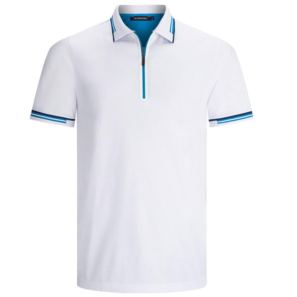 Be stylish with a custom designer look in the Bugatchi Men's Blue White Short Sleeve Half Zip Polo Collar. The solid color with accent collar and sleeve cuffs will carry your company logo with precision and flair as you wear this as corporate apparel that easily transitions to the golf course. Excellent for layering with a jacket or sweater, the short sleeve polo offers a half zip design for that little bit of extra. Choose your embroidery design and use these as high end gifts of employee apparel or even employee gifts for any special occasion. The unique color will really stand out and become an instant favorite.Highlights