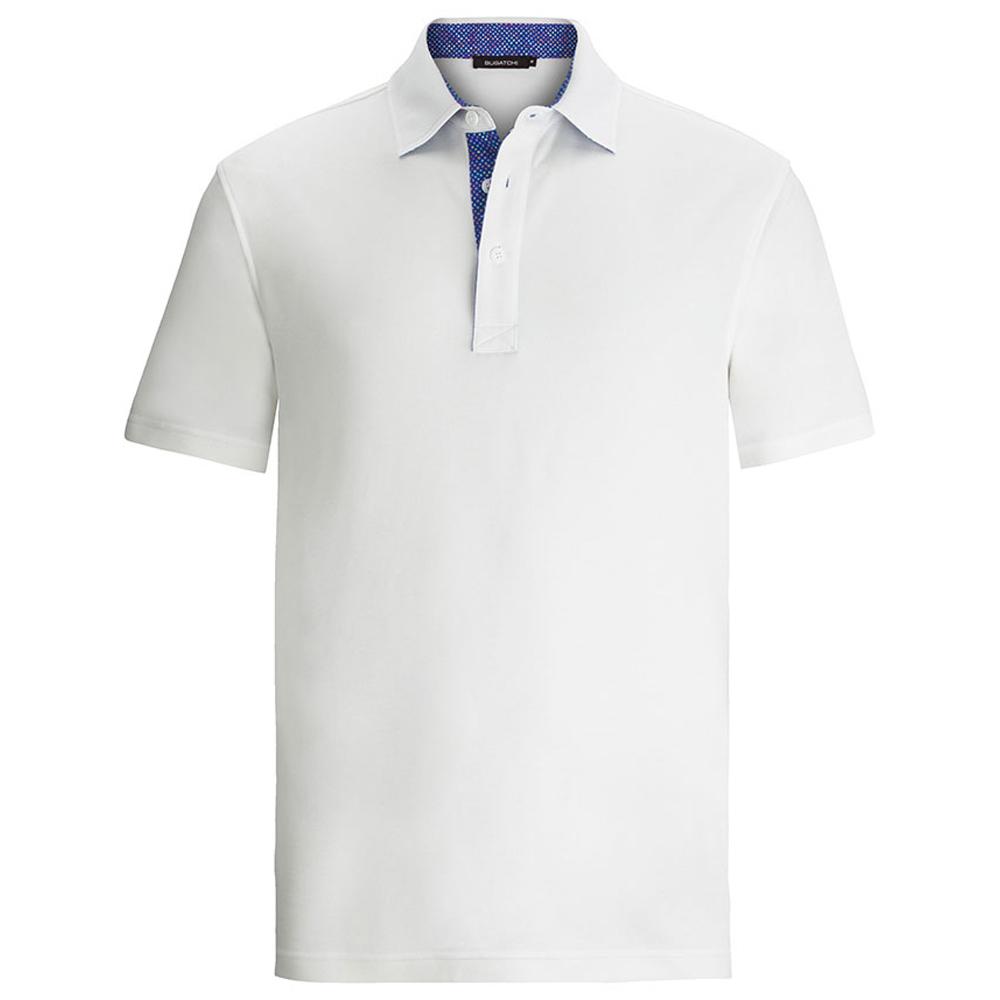 Create a custom embroidery Bugatchi Men's White Short Sleeve Three Button Polo Collar that is ideal as a gift or employee apparel. Simple enough to carry your custom logo with pride, yet luxurious enough to be used as corporate apparel. Allowing for a wide range of movement on the golf course or diverse enough to carry your custom logo and be used as high end gifts. The three button collar offers the classic look of a polo that will seamlessly fit into your wardrobe no matter your form of employment. Place an order for a few or a large amount to use for your purposes.Highlights