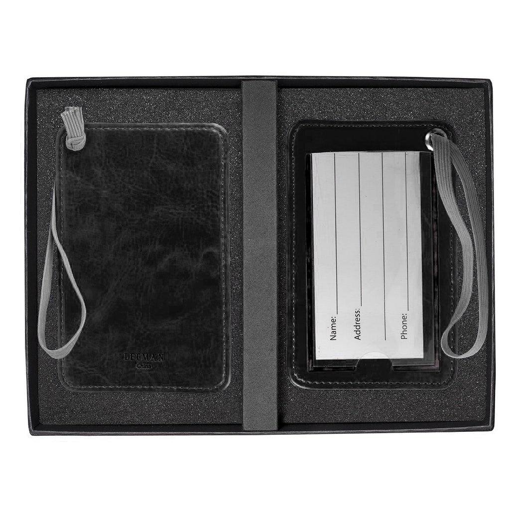 Ready to take your business logo on the road? This practical marketing tool will "tag" along nicely to your company's promotional events. Leeman Black Venezia Luggage Tag Set is made from PU material and features a clear PVC display window. Designed with an elastic strap for attaching to baggage. Add your logo to create a handy giveaway during conferences and trade shows. An excellent promo item for travel agencies, tour companies and airlines. Comes complete with gift box.The minimum order for this product is 48 pieces.