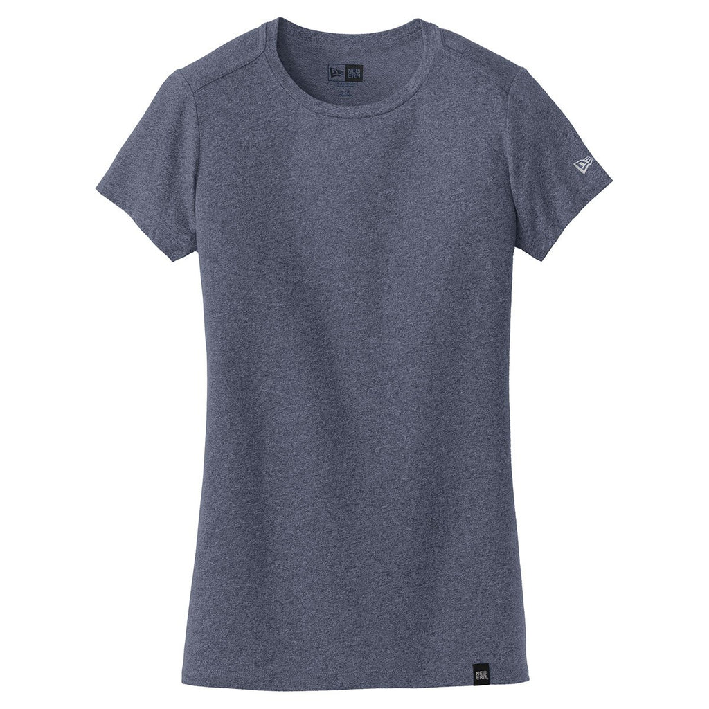 With a logoed New Era Women's True Navy Heather Heritage Blend Crew Tee, you create a powerful marketing platform for your company. Simply attach your corporate logo on the large imprint area to enjoy more exposure for your brand in the community. The 60% cotton fabric feels smooth on the skin to offer comfort throughout the day. Forty percent polyester withstands the punishment received during high-energy recreational activities. Enjoy an itch free shirt that uses a heat transfer label instead of a sewn on tag. Reverse neck and shoulder taping produce a refined appearance worthy of your esteemed professional status.Corresponding Men's Style: New Era Men's True Navy Heather Heritage Blend Crew Tee