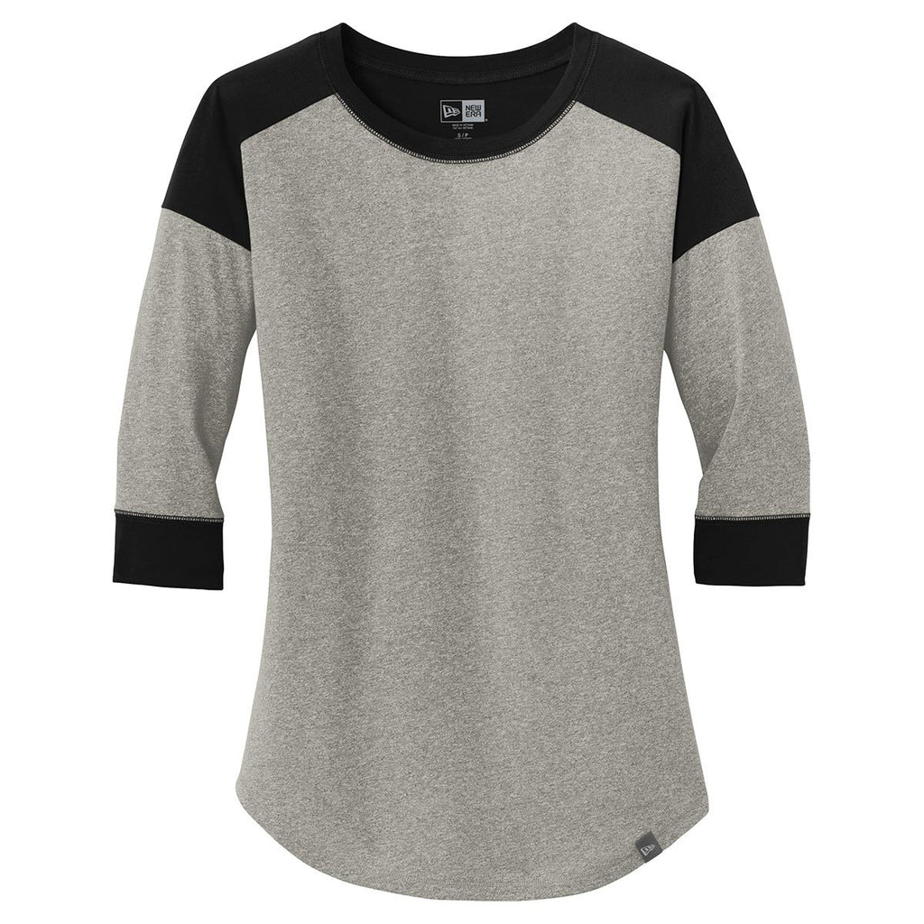 Class heritage styles heavily influences the appearance of stylish custom logoed New Era Women's Black/Rainstorm Grey Heather Heritage Blend 3/4 Sleeve Baseball Raglan Tee. With a scalloped hem and shoulder and back yoke color blocking the all-purpose tee is a fashion hit during business trips. Attach your corporate logo to let everyone know your company stands for delivering high-quality products. Cotton brings to the fashion table supreme comfort, while blended polyester resists rips and tears to give you a go to tee for all occasions. Raglan sleeves create more arm motion, which helps you reach difficult to access areas of your property.Corresponding Men's Style: New Era Men's Black/Rainstorm Grey Heather Heritage Blend 3/4 Sleeve Baseball Raglan Tee
