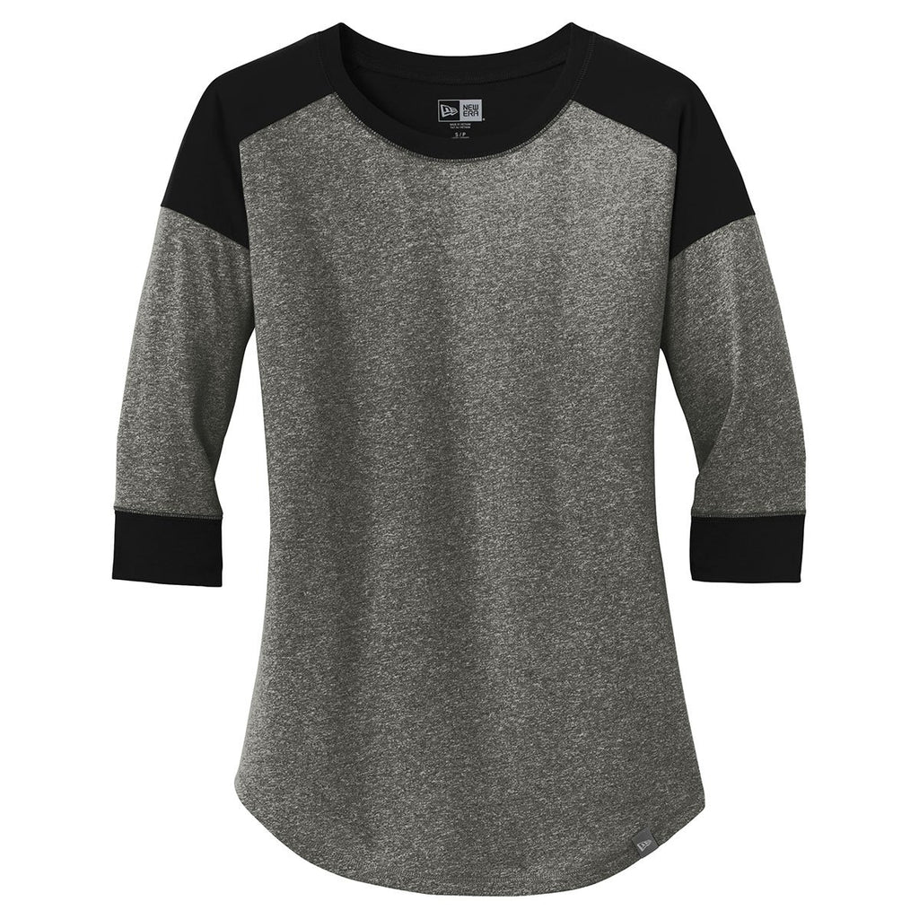 Class heritage styles heavily influences the appearance of stylish custom logoed New Era Women's Black/Black Twist Heritage Blend 3/4 Sleeve Baseball Raglan Tee. With a scalloped hem and shoulder and back yoke color blocking the all-purpose tee is a fashion hit during business trips. Attach your corporate logo to let everyone know your company stands for delivering high-quality products. Cotton brings to the fashion table supreme comfort, while blended polyester resists rips and tears to give you a go to tee for all occasions. Raglan sleeves create more arm motion, which helps you reach difficult to access areas of your property.Corresponding Men's Style: New Era Men's Black/Black Twist Heritage Blend 3/4 Sleeve Baseball Raglan Tee