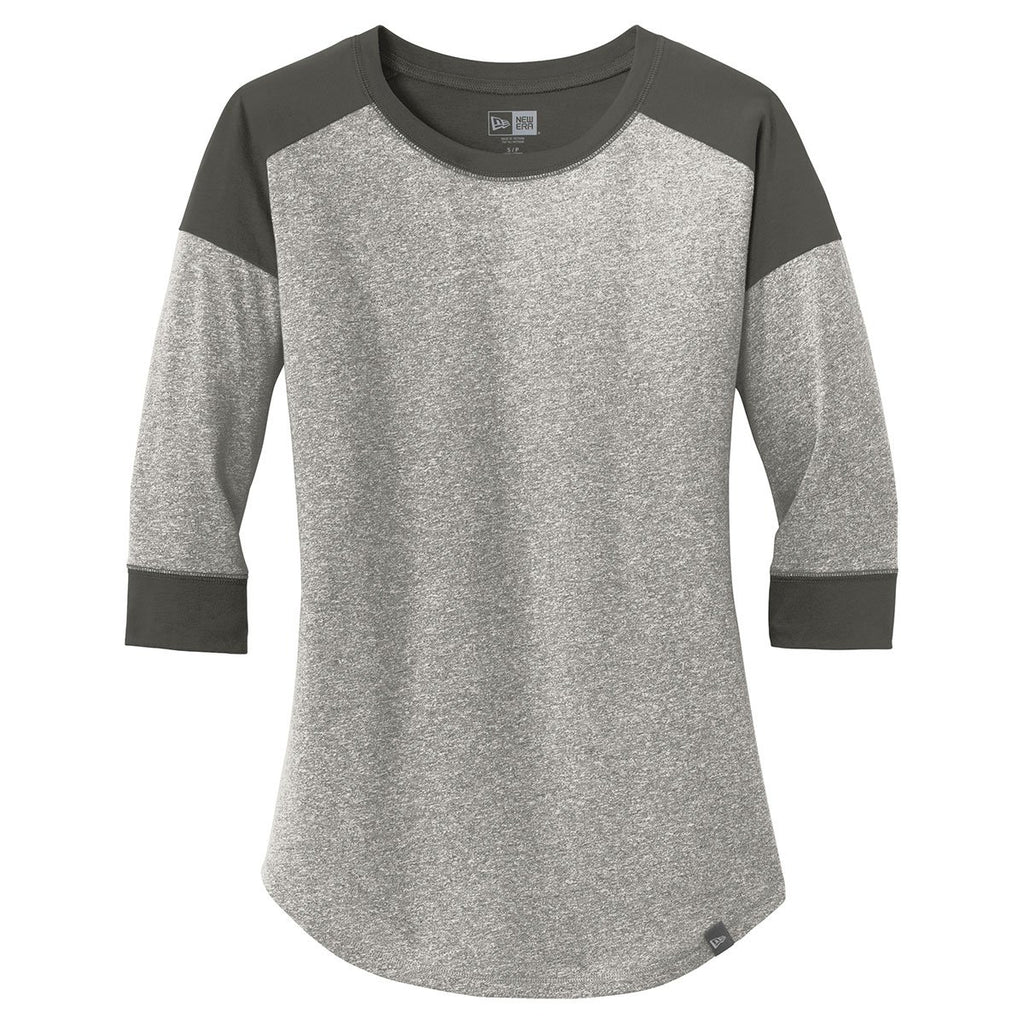 Class heritage styles heavily influences the appearance of stylish custom logoed New Era Women's Graphite/Light Graphite Twist Heritage Blend 3/4 Sleeve Baseball Raglan Tee. With a scalloped hem and shoulder and back yoke color blocking the all-purpose tee is a fashion hit during business trips. Attach your corporate logo to let everyone know your company stands for delivering high-quality products. Cotton brings to the fashion table supreme comfort, while blended polyester resists rips and tears to give you a go to tee for all occasions. Raglan sleeves create more arm motion, which helps you reach difficult to access areas of your property.Corresponding Men's Style: New Era Men's Graphite/Light Graphite Twist Heritage Blend 3/4 Sleeve Baseball Raglan Tee