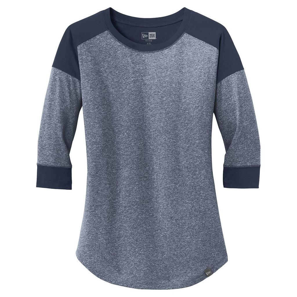 Class heritage styles heavily influences the appearance of stylish custom logoed New Era Women's True Navy/True Navy Twist Heritage Blend 3/4 Sleeve Baseball Raglan Tee. With a scalloped hem and shoulder and back yoke color blocking the all-purpose tee is a fashion hit during business trips. Attach your corporate logo to let everyone know your company stands for delivering high-quality products. Cotton brings to the fashion table supreme comfort, while blended polyester resists rips and tears to give you a go to tee for all occasions. Raglan sleeves create more arm motion, which helps you reach difficult to access areas of your property.Corresponding Men's Style: New Era Men's True Navy/True Navy Twist Heritage Blend 3/4 Sleeve Baseball Raglan Tee