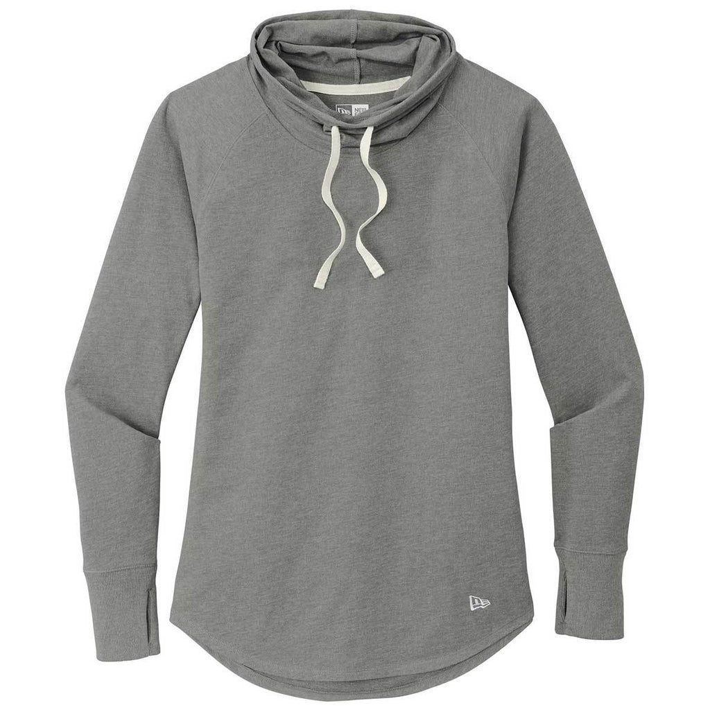 Head out for a morning jog or to that morning meeting in comfort with a custom New Era Women's Shadow Grey Heather Sueded Cotton Blend Cowl Tee. Made of a combination of sueded ring spun cotton and poly, this tee will look great with the screen print of your choice. The relaxed fit of this long sleeve tee means comfort all day. Small additions like contrast twill drawcords, rib knit cuffs, a curved drop tail hem, and thumbholes create a unique look for this tee that would serve well as an end of the year gift with a company logo. Your screen print will stand out whether used as company uniforms or employee gifts that will be a real hit.Corresponding Men's Style:New Era Men's Shadow Grey Heather Sueded Cotton Blend Quarter Zip Pullover