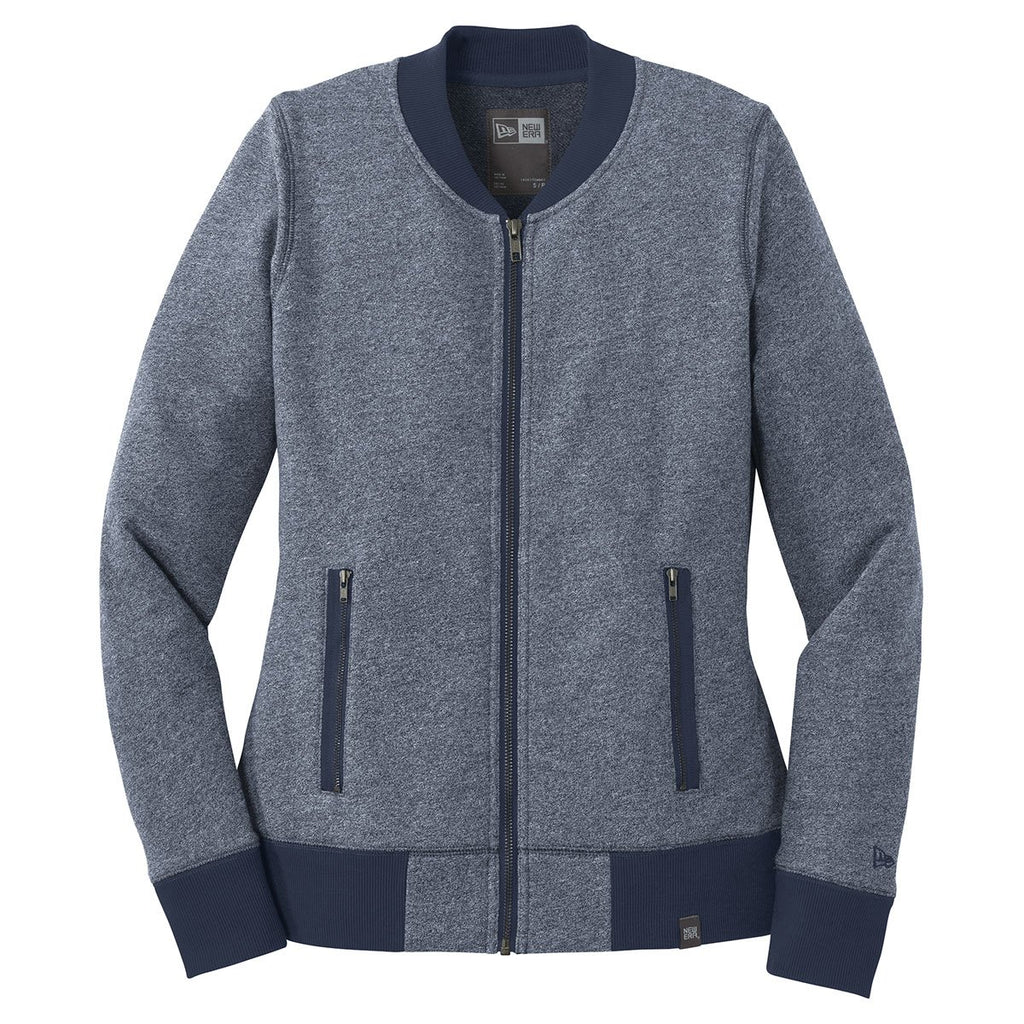 Match our national pastime with fashionable corporate apparel and you have the embroidered New Era Women's True Navy/True Navy Twist French Terry Baseball Full-Zip. Exposed black nickel zippers and contrast rib knit cuffs up the fashion ante for corporate apparel. The chic full-zip contains a blend of cotton and polyester to create a smooth fabric that withstands the punishment delivered by participating in outdoor activites. Sueded French terry design will turn heads at the next corporate event. Make sure to keep customer prospect eyes glued to the elegantly designed full zip by adding your corporate logo on the large imprint area.Corresponding Men's Style:New Era Men's True Navy/True Navy Twist French Terry Baseball Full-Zip