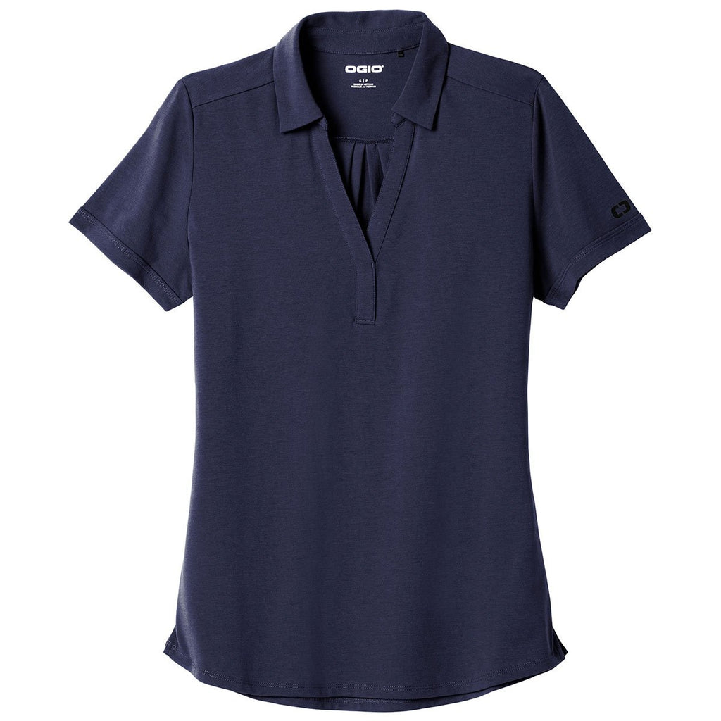 Make a lasting impression on customers by ordering the custom logoed OGIO Women's Navy Limit Polo for the members of your corporate team. As one of the most stylish short sleeve shirts for employee uniforms, the cotton and polyester blended polo withstands the rigors of frequent use to deliver years of fashionable performance. Stylish open Y-neck placket exudes class, while the set-on, cuffed sleeves allow for optimal arm movement flexibility. Moisture wicking technology ensures maximum comfort throughout every workday. Attach your company logo on the large screen embroidered area to power your brand to the top of the competition.Corresponding Men's Style: OGIO Men's Navy Limit Polo