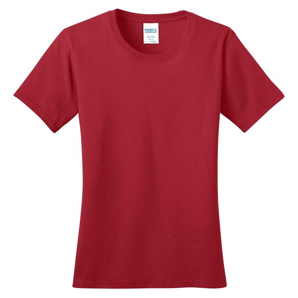 Spun from ultrasoft ringspun cotton, this Port & Company Women's Red Ring Spun Cotton Tee flaunts a feminine cut and a relaxed fit for all-day comfort. Soft, breathable fabric keeps you cool in this tee featuring 1-inch extra length in the body. Comes with a removable tag for comfort and relabeling. Adorn this crew neck tee with your company's logo or message to gift it to your clients as a corporate give-away or a summer uniform staple for your employees. Either way, it will help your company or organization stand out and create an impactful brand identity.Corresponding Men's Style: Port & Company Men's Red Ring Spun Cotton Tee