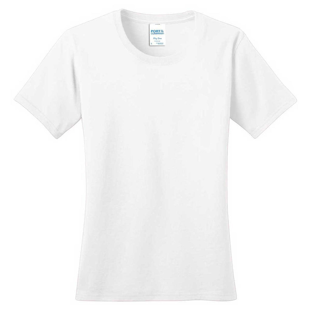 Spun from ultrasoft ringspun cotton, this Port & Company Women's White Ring Spun Cotton Tee flaunts a feminine cut and a relaxed fit for all-day comfort. Soft, breathable fabric keeps you cool in this tee featuring 1-inch extra length in the body. Comes with a removable tag for comfort and relabeling. Adorn this crew neck tee with your company's logo or message to gift it to your clients as a corporate give-away or a summer uniform staple for your employees. Either way, it will help your company or organization stand out and create an impactful brand identity.Corresponding Men's Style: Port & Company Men's White Ring Spun Cotton Tee