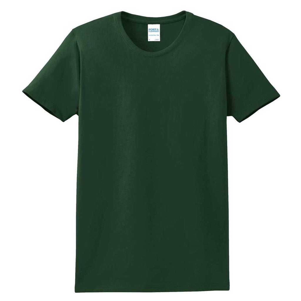 A perennial favorite, this Port & Company Women's Dark Green Essential Tee is crafted from lightweight, soft-spun cotton. Declared as "most popular" by groups and teams across America. Features a shorter midriff and sleeves for a more feminine fit. Emblazon this crew neck tee with your company's logo or message to gift it to your clients as a corporate give-away or a summer uniform staple for your employees. Either way, it will help your company or organization stand out and create an impactful brand identity.Highlights