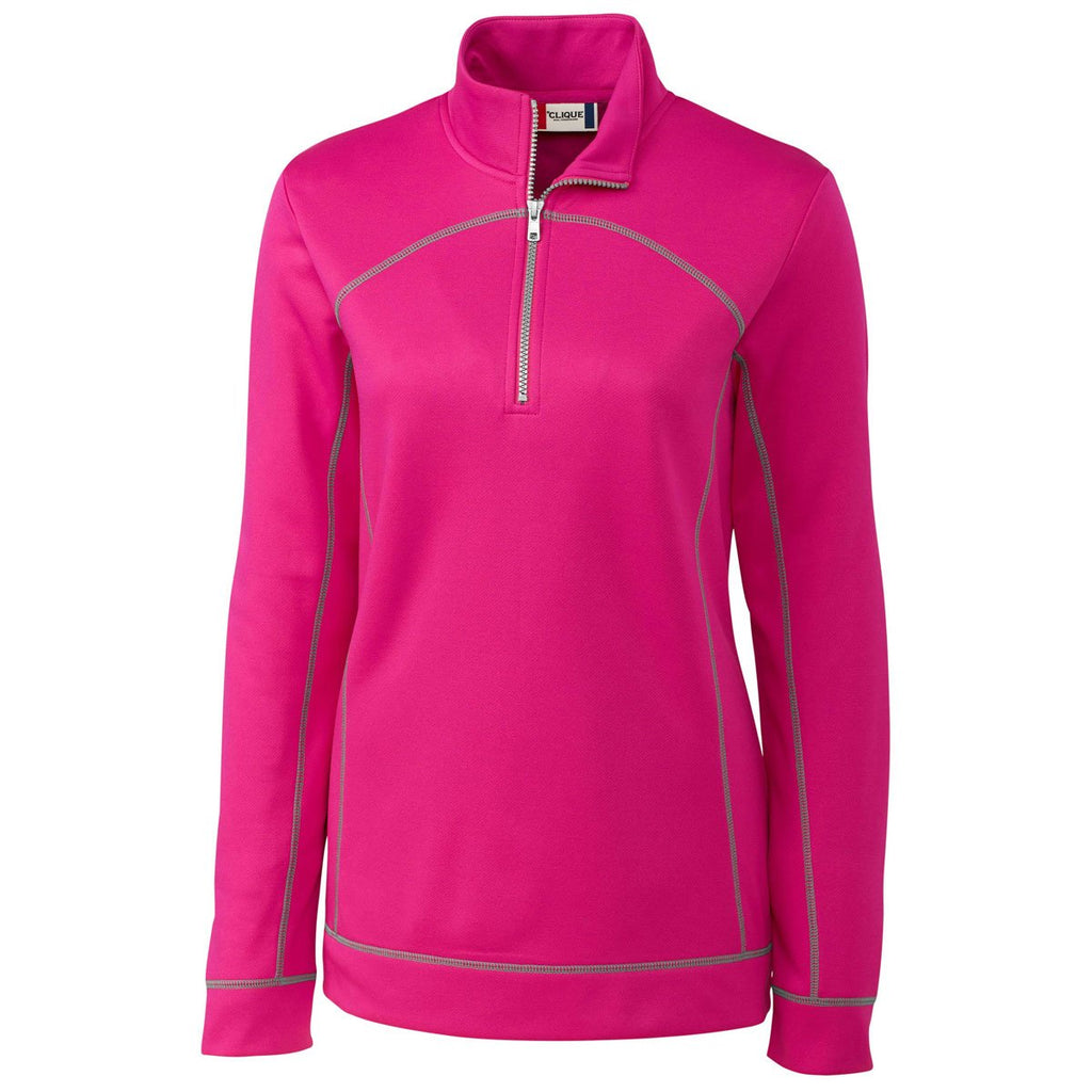 With super soft fleece on the inside, the logoed Clique Women's Ribbon Pink Helsa Half Zip does a great job of trapping body heat to keep you feeling warm all day long during weekend camping trips. The shiny polyester fabric remains in mint condition even after going through years of high performance use. Moisture wicking technology makes the half zip jacket perfect for layering over a Clique tee or as the middle layer of a cold weather fashion ensemble. Add a custom logo on the large embroidery area to shine the marketing spotlight on your products and services.Highlights