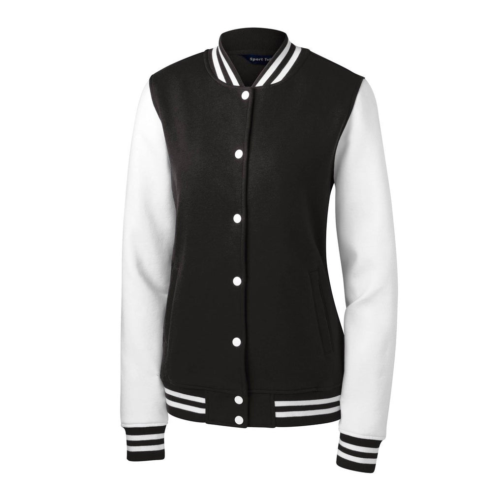 Try ignoring the weather outside one day and seeing how well you dress. Not such a great idea, was it? That's because the weather is by definition unpredictable; if you're going to want to be prepared, you're going to have to wear the jackets that separate you from mother nature. This Sport-Tek Women's Black/White Fleece Letterman Jacket is just what you need. Simply add your corporate logo to one of these pieces to make it a great embroidered piece of business apparel.Corresponding Men's Style: Sport-Tek Men's Black/Vintage Heather Fleece Letterman Jacket