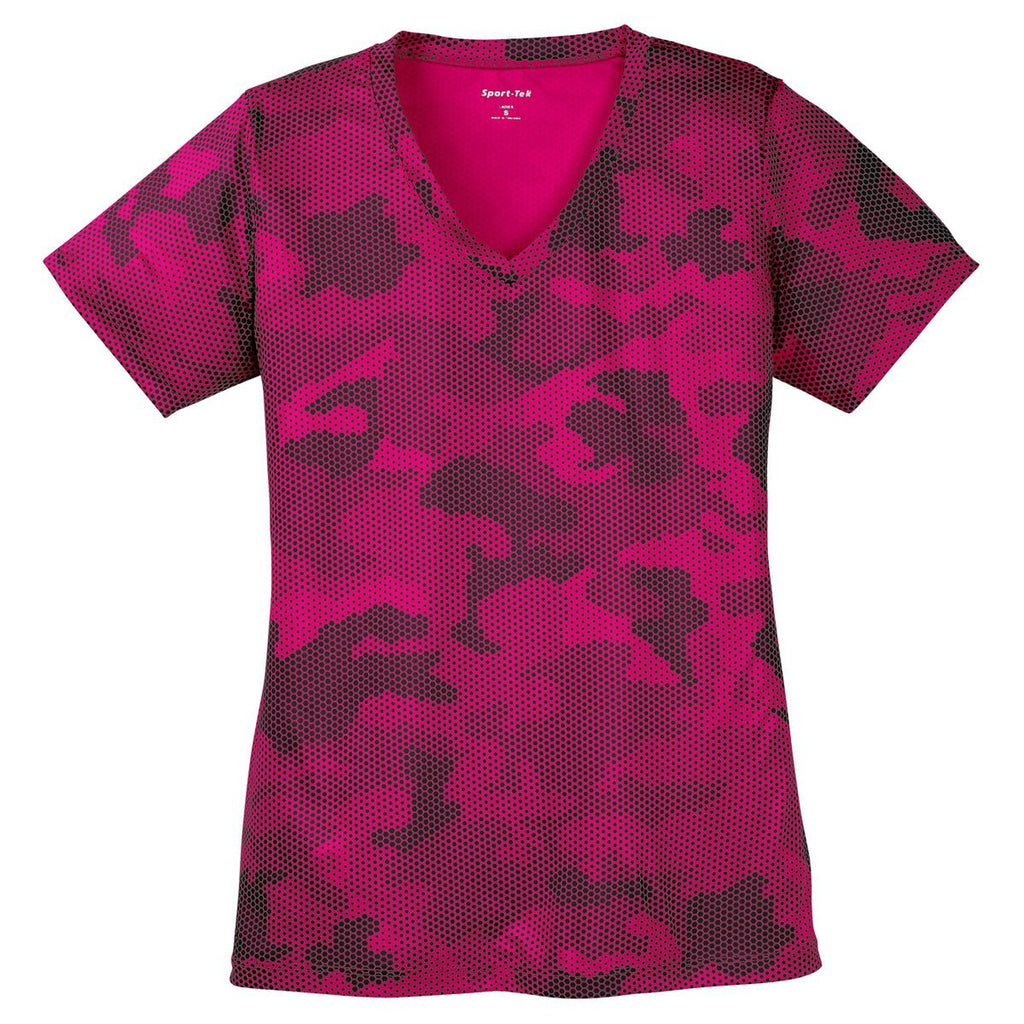 Sport-Tek Women's Pink Raspberry CamoHex V-Neck Tee