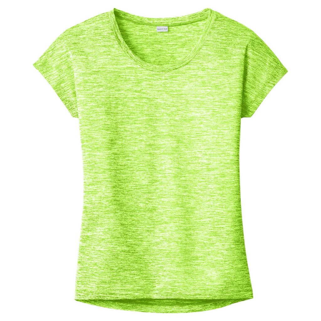 Do moisture laden t-shirts bog you down whenever you need to ramp up the competitive juices? Sport-Tek Women's Lime Shock Electric PosiCharge Electric Heather Sporty Tee contain moisture wicking technology that quickly evaporates perspiration the instant it forms on your skin. The result is a cooling of the skin that invigorates your body. Set-in sleeves allow for more arm movement, which comes in handy on the golf course and tennis court. The super soft fabric endures countless wash and dry cycles, without any of the colors fading. One-hundred percent rugged polyester interlock resists rips and tears. Attach your company logo to the t-shirts to spread the word about your brand.Corresponding Men's Style: Sport-Tek Men's Lime Shock Electric PosiCharge Electric Heather Tee