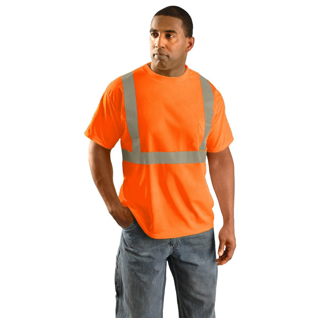 Two inches of Scotchlite reflective tape keep you safe working outside at night. The highly visible reflective tape even cuts through light fog to alert drivers of your presence. Rugged polyester endures years of punishment dished out by outdoor construction projects. OccuNomix Men's Orange Classic Standard Wicking Birdseye T-Shirt wick moisture to keep you comfortable under intense working environments. The moisture wicking properties especially come in handy during extended days working in humid conditions. Use the chest pocket for storing electronic devices. Take advantage of the large area to embroider your corporate logo. Company apparel that includes custom logos increase recognition of your brand in the community.