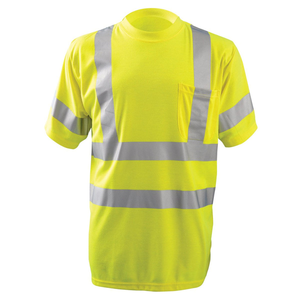 With an area to add a screen print custom logo, OccuNomix Men's Yellow Premium Dual Stripe Wicking T-Shirt offer your company an affordable way to gain exposure in the community. Logoed apparel for workers that spend most of their days outside does an excellent job of exposing your company to passing motorists and pedestrians. One-Hundred percent ANSI wicking polyester keeps you in your comfort zone throughout each workday. The lightweight fabric includes two-inch reflective tape that reflects light back to nearby motorists and cyclists. Use the large left chest pocket to keep pens and pencils handy on the job.Highlights