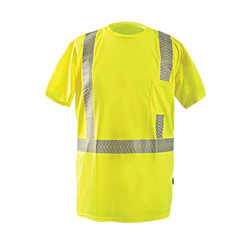 Made using Birdseye Polyester fabric, this OccuNomix Men's Yellow Segmented Tape Short Sleeve T-Shirt has been designed with a modern look in mind, promising you both feel and look good while working. This Hi Vis Safety Shirt is ANSI Class 2 Compliant. It feels soft on the inside, yet is work-wear durable. The performance fabric wicks away moisture faster than other fabrics, keeps you dry and comfortable and works to minimizes odor. Accented by patent-pending chevron design segmented reflective tape for optimal visibility. This lightweight shirt is absorbent and easy to care for. Ideal for building and construction, mining, transport & storage, warehouses, exploration, and field sites.Highlights