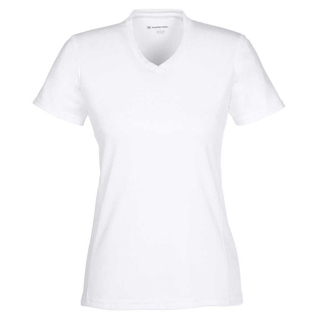 The stylish feminine V-neck design and decorative front seams make the Harriton Women's White 4.2 oz. Athletic Sport T-Shirt perfect for active women. Rugged 100% polyester resists the types of rips and tears that render other sports t-shirts to second hand thrift stores. Moisture wicking technology quickly evaporates perspiration to ensure you enjoy maximum comfort. Ultraviolet ray protection prevents skin damage caused by prolonged stints under the blazing sun. The comfortable fit allows you to wear the multi-purpose polo to work and then keep it on for the big game. Add your corporate logo to generate buzz about your company.Corresponding Men's Style: Harriton Men's White 4.2 oz. Athletic Sport T-Shirt