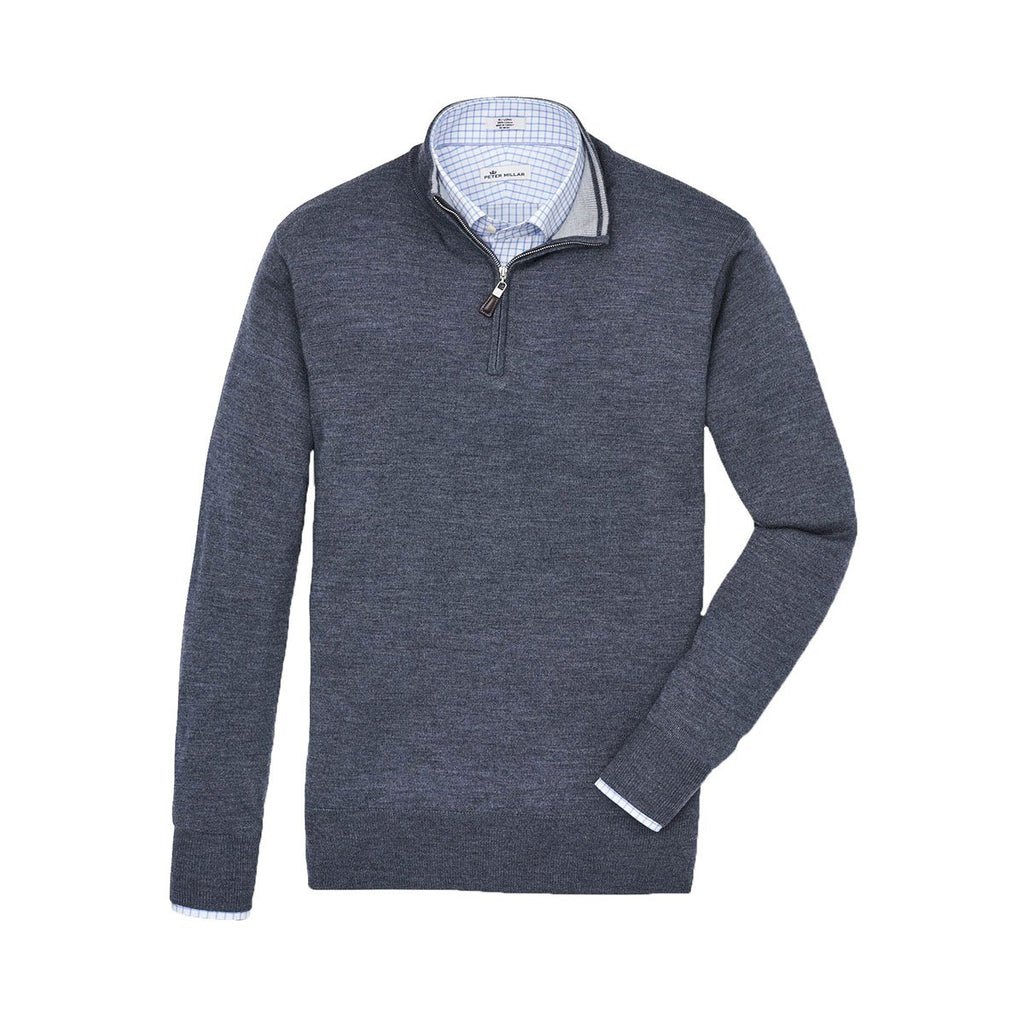 As the weather starts to change and temperatures are unpredictable the Peter Millar Men's Charcoal Crown Soft Quarter Zip can keep you warm on those days that the temperatures are unpredictable. Easy to wear as part of a layered look, the wool and silk quarter zip offers a classic fit with ribbed waist, neck, and cuffs. Add a custom logo to use this pullover as employee apparel or corporate wear when entertaining potential client out and about or even on the golf course. The generous fit allows for easy layering with your choice of wear. Order one or several to offer as high end gifts to those who matter most.