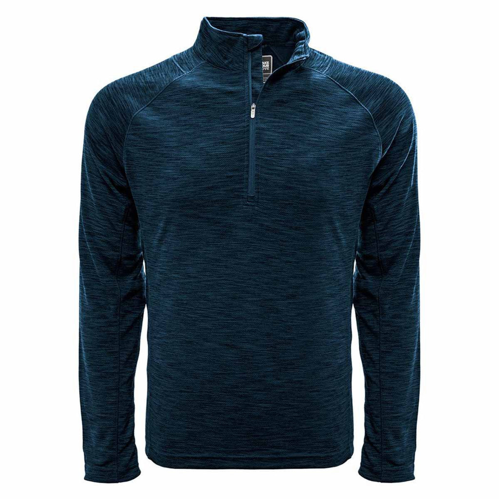 With a tonal space-dyed effect, the company logoed Levelwear Men's Navy Mobility Quarter Zip will change the way you view corporate apparel. Raglan sleeves create a stylish appearance that attracts the attention of your professional peers at industry trade shows. Take advantage of the attention by attaching your corporate logo on the large imprint area. Mechanical stretch polyester gives you more mobility to reach difficult to access spaces in your backyard. Moisture wicking technology quickly removes perspiration to cool the skin. The quarter-zip front closure makes putting on and taking off the lightweight jacket a breeze.Highlights