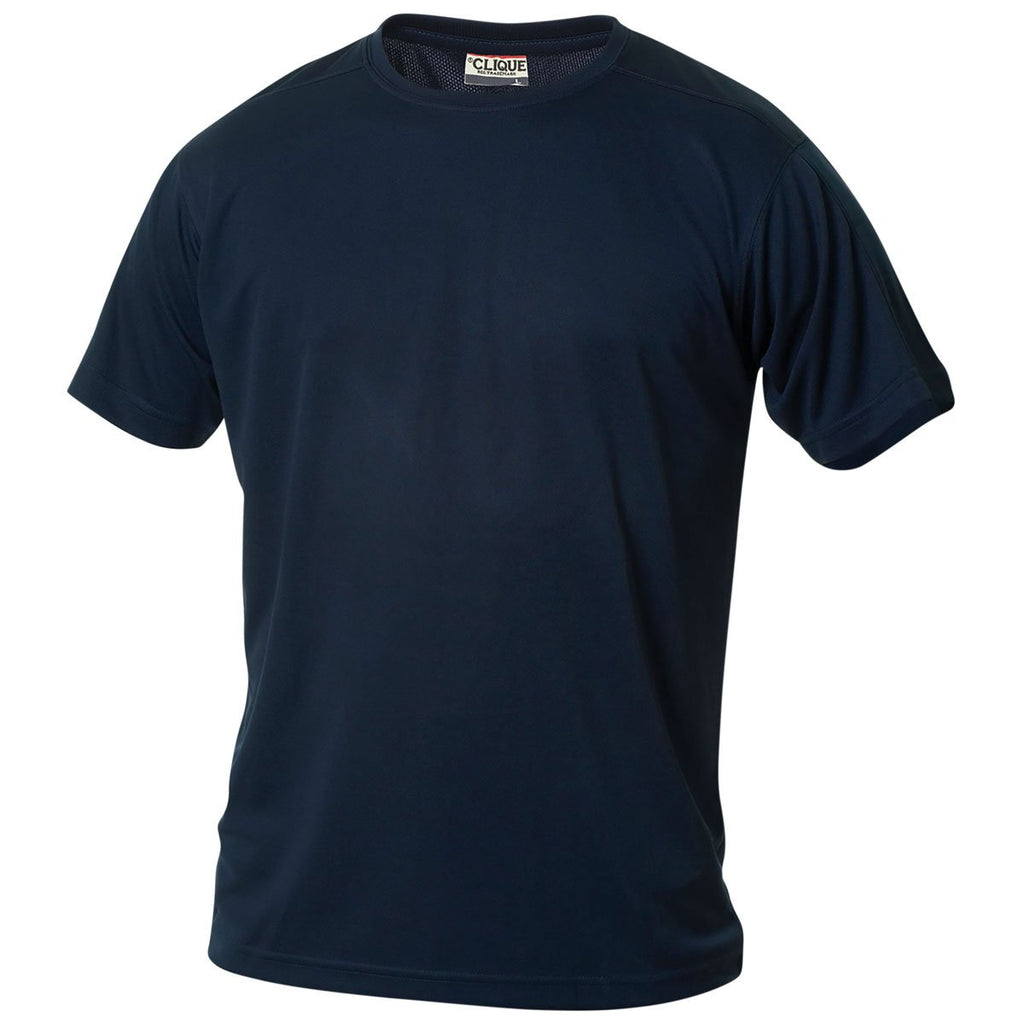 As an only layer for casual company apparel, the corporate logoed Clique Men's Dark Navy Ice Tee is the perfect uniform to wear on a softball or in the work-related field when you meet with customers. The 100% polyester mesh fabric allows air to circulate around the back and chest to ensure you remain comfortably cool throughout every busy day. Pieced shoulders present a more upscale appearance for a tee destined to be the shirt you give away at the next corporate golf tournament. Open sleeves improve mobility to help you achieve more power on your golf swing. Screen print a custom logo for broadening your marketing message everywhere you travel.Highlights