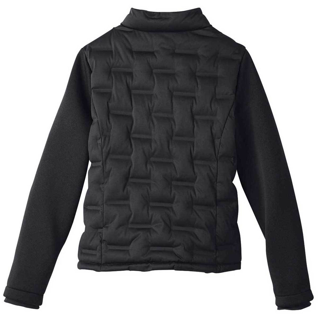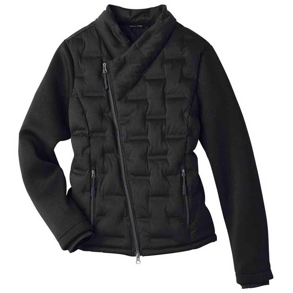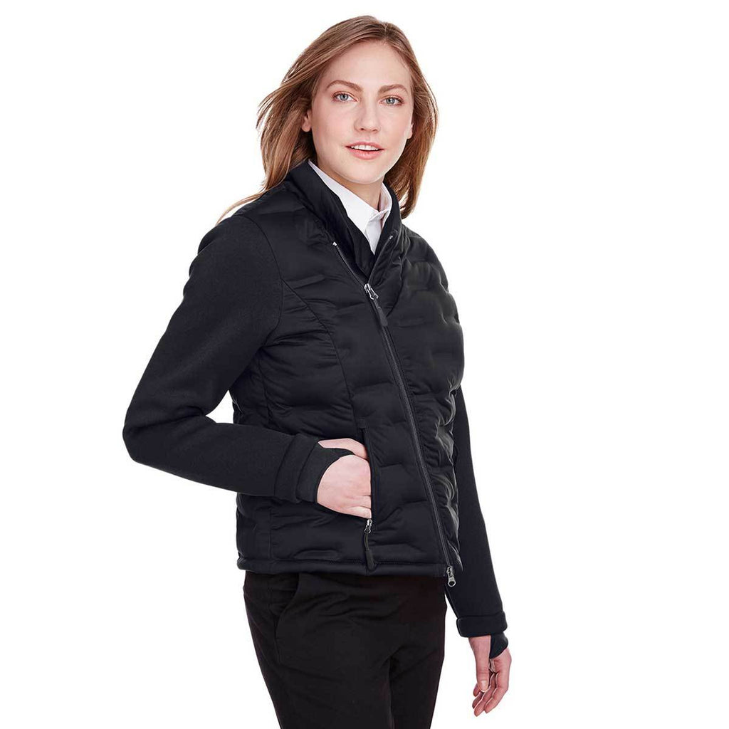 Express yourself in a custom embroidered North End Women's Black/Black/Carbon Pioneer Hybrid Bomber Jacket. This jacket does it all with your company logo proudly displayed. Water resistant, wind resistant, and layered for warmth, this bomber jacket is great for creating a unique look all your own. The offset zipper adds flair to the quilted look that easily goes from the office to a night out. Add a corporate embroidery to wear this jacket to team events or give as end of the year gifts to employees, family members, and friends. Place an order today to keep these top of the line jackets on hand for whatever needs may arise.
