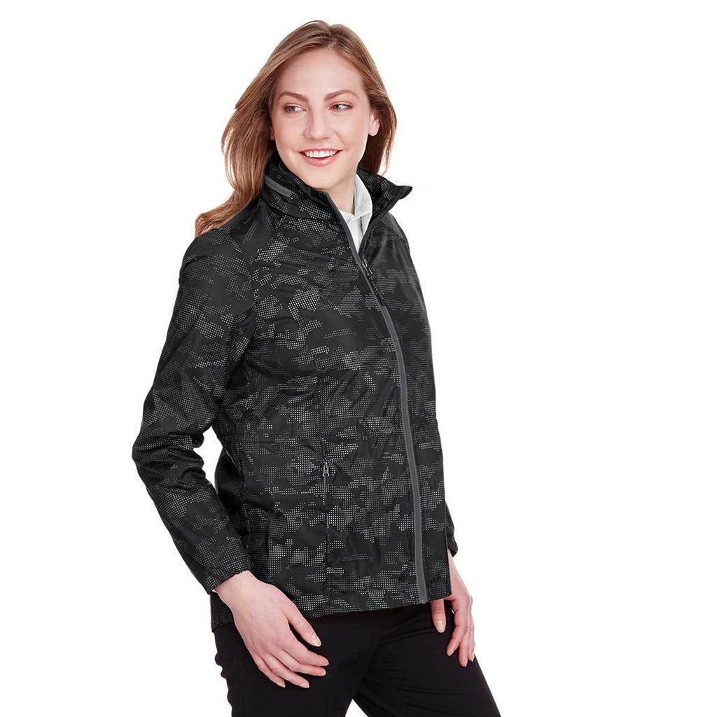 Get noticed in a custom embroidered North End Women's Black/Carbon Rotate Reflective Jacket with reflective print. Made of polyester with Hydropel water resistant finish, this jacket will stand up to a pop up rain storm without sacrificing comfort. The beautifully designed jacket can carry a company logo or corporate embroidery to use as a company uniform or a design of your choice can be added to offer these as end of the year gifts for anyone you care to share with in life. A unique option for team events, this jacket provides a storm placket with chin guard, rollaway hood, extended body length, and a center back vent. Comfort and convenience all wrapped up into one.Corresponding Men's Style: North End Men's Black/Carbon Rotate Reflective Jacket