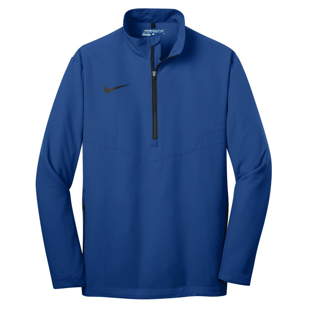 Golfing isn't just a summer sport. The Nike Men's Blue Dri-FIT Long Sleeve Half Zip Wind Shirt is designed with the chilly, breezy days in mind, including a streamlined design that is lightweight and very comfortable. The Nike Golf Men's Blue Dri-FIT Long Sleeve Half Zip Wind Shirt is a high performance outerwear piece that will fight the wind so that you can concentrate on your game. It features zippered pockets, adjustable cuffs, a drawcord hem and a Swoosh trademark design on the right chest.