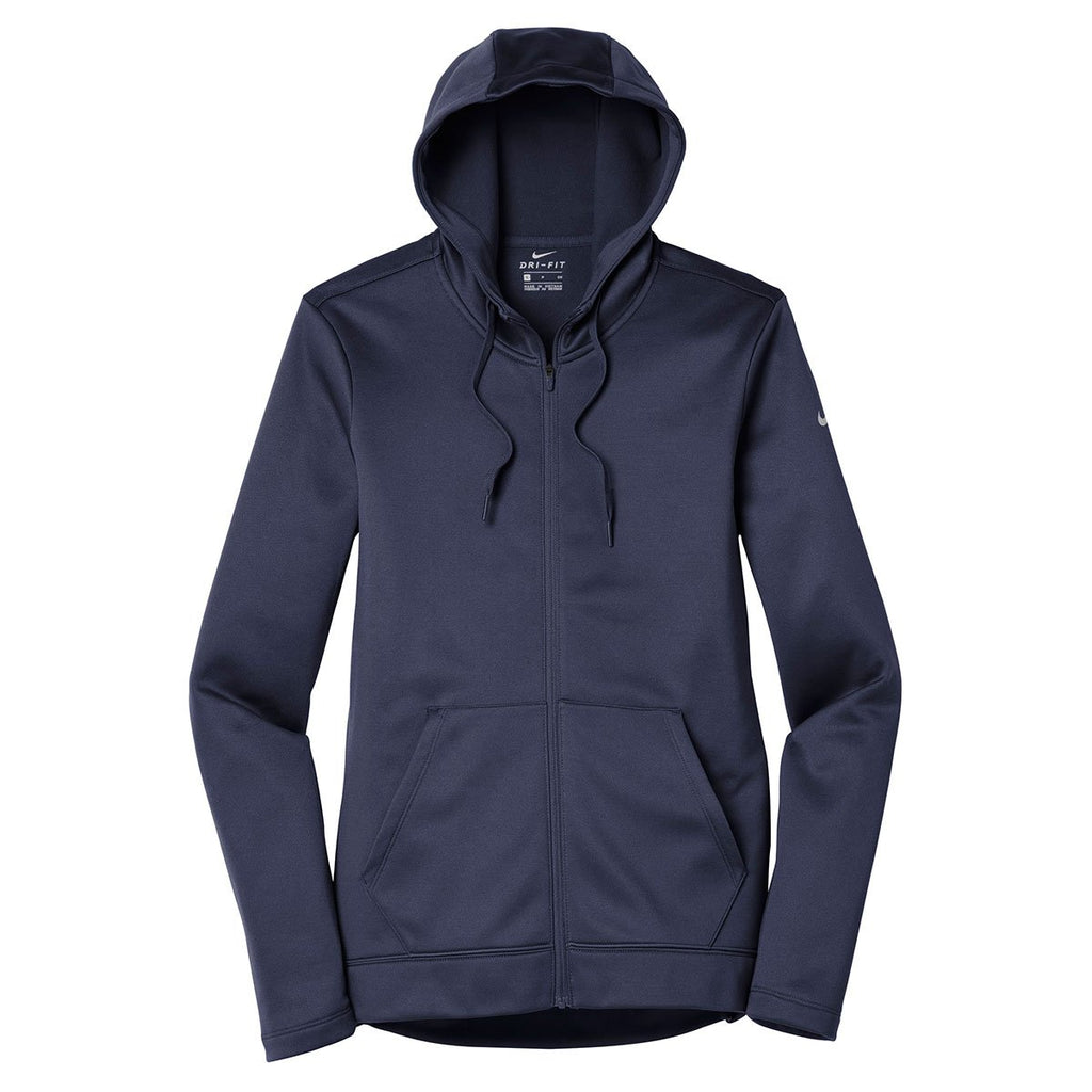 Designed to include proprietary Therma-FIT technology, the custom logoed Nike Women's Midnight Navy Therma-FIT Full-Zip Fleece Hoodie traps body heat to ensure you enjoy supreme comfort all day whenever the temperature dips below freezing. Moisture management properties ensure the skin remains comfortably dry. Rugged 100% polyester resists rips and tears to make the fleece hoodie ideal for outdoor enthusiasts. Kangaroo pockets warm the hands, as well as conveniently store small electronic devices. Attach your corporate logo to broaden your company's reach in the community. With logoed apparel, you create a cost effective way to sell your brand image.Corresponding Men's Style:Nike Men's Midnight Navy Therma-FIT Full-Zip Fleece Hoodie