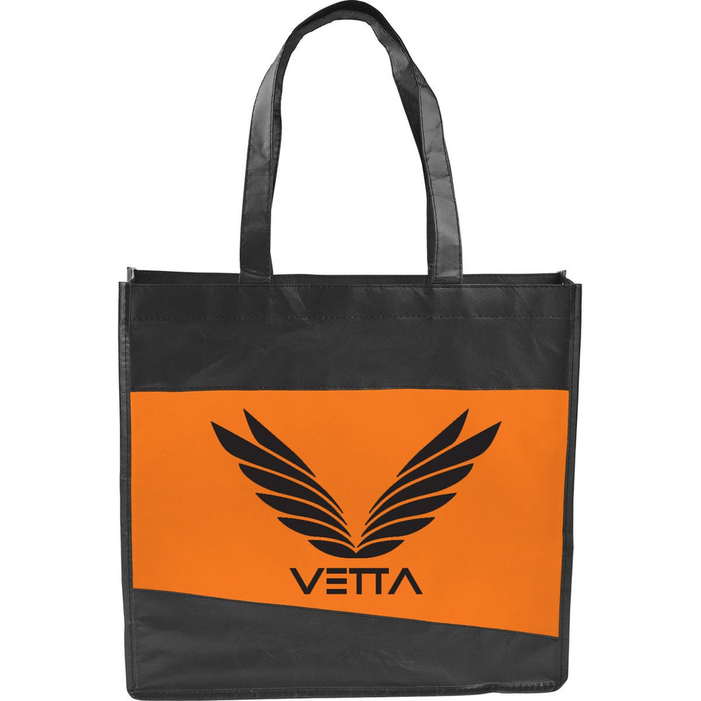 The Bullet Orange Laminated Non-Woven Convention Tote provides a glossy look and a color splash that can help your corporate logo stand out. You can hand these out at recruiting events or trade shows as a promotional tool that associates your company name with style and professionalism.