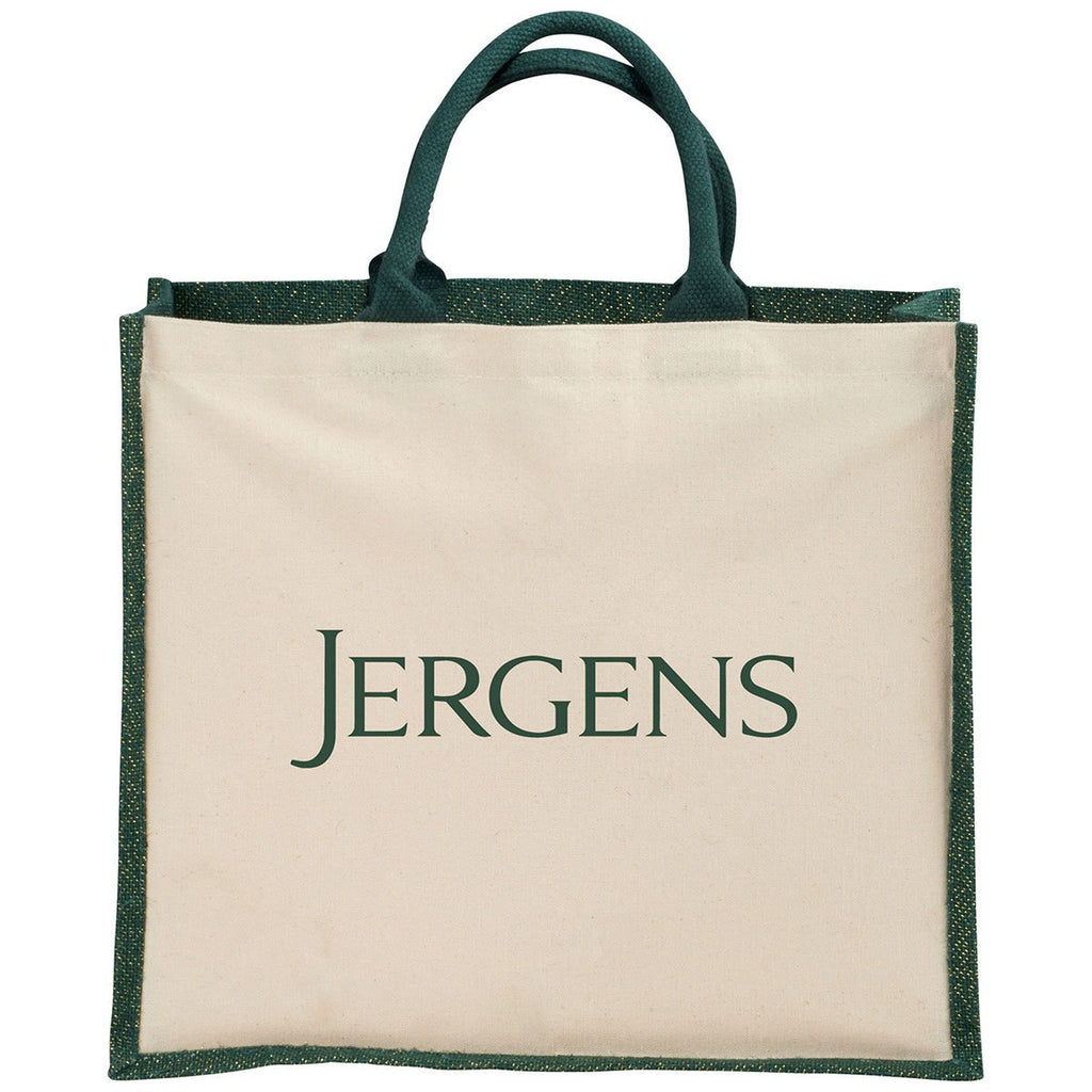 The Bullet Hunter Green Metallic Jute Cotton Canvas Shopper Tote is the perfect canvas for your corporate logo, making this piece a promotional tool that you can hand out at recruiting events and trade shows. It can be used and re-used as a shopping bag, giving your company name plenty of exposure. The minimum order for this product is 100 pieces.