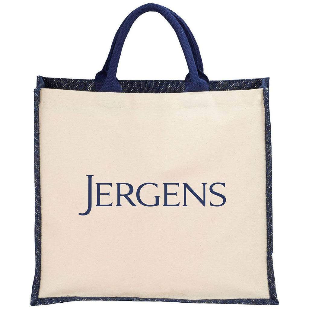 The Bullet Navy Blue Metallic Jute Cotton Canvas Shopper Tote is the perfect canvas for your corporate logo, making this piece a promotional tool that you can hand out at recruiting events and trade shows. It can be used and re-used as a shopping bag, giving your company name plenty of exposure. The minimum order for this product is 100 pieces.