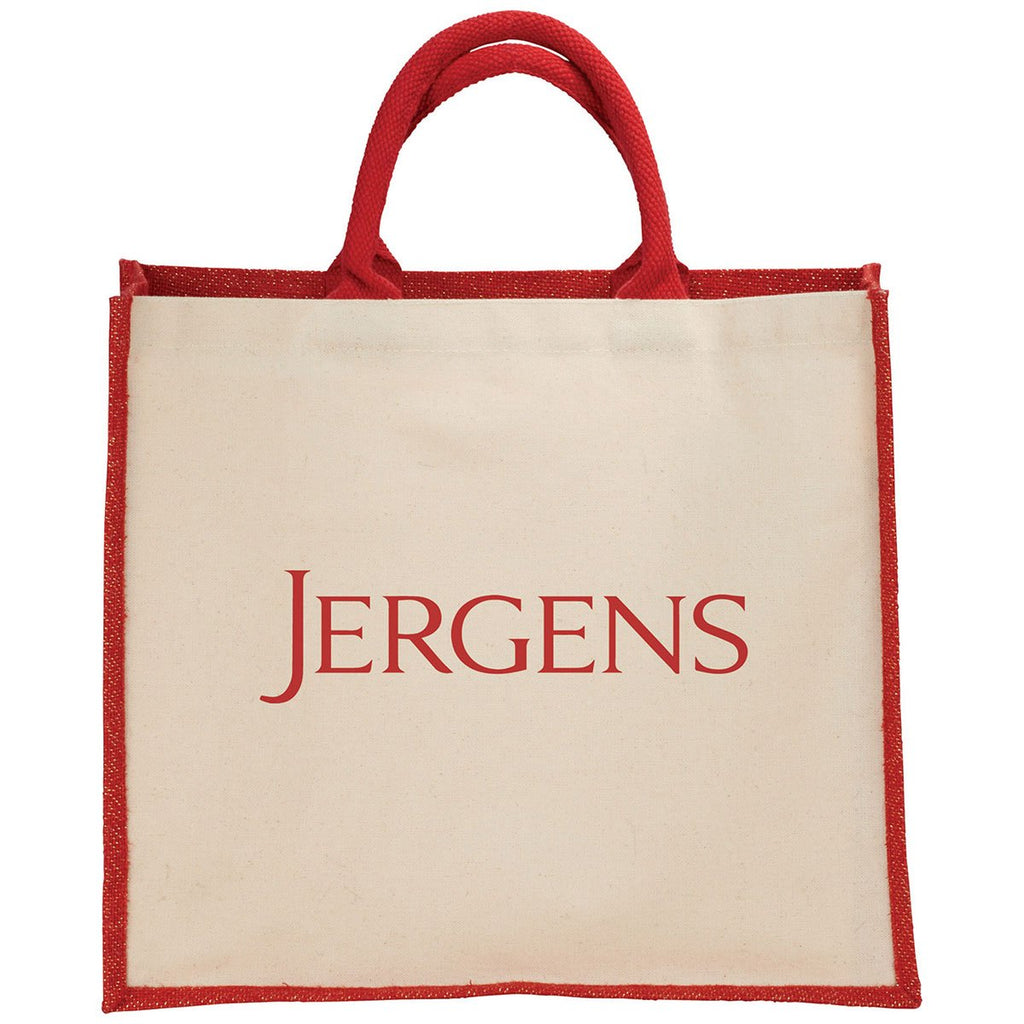 The Bullet Red Metallic Jute Cotton Canvas Shopper Tote is the perfect canvas for your corporate logo, making this piece a promotional tool that you can hand out at recruiting events and trade shows. It can be used and re-used as a shopping bag, giving your company name plenty of exposure. The minimum order for this product is 100 pieces.Highlights