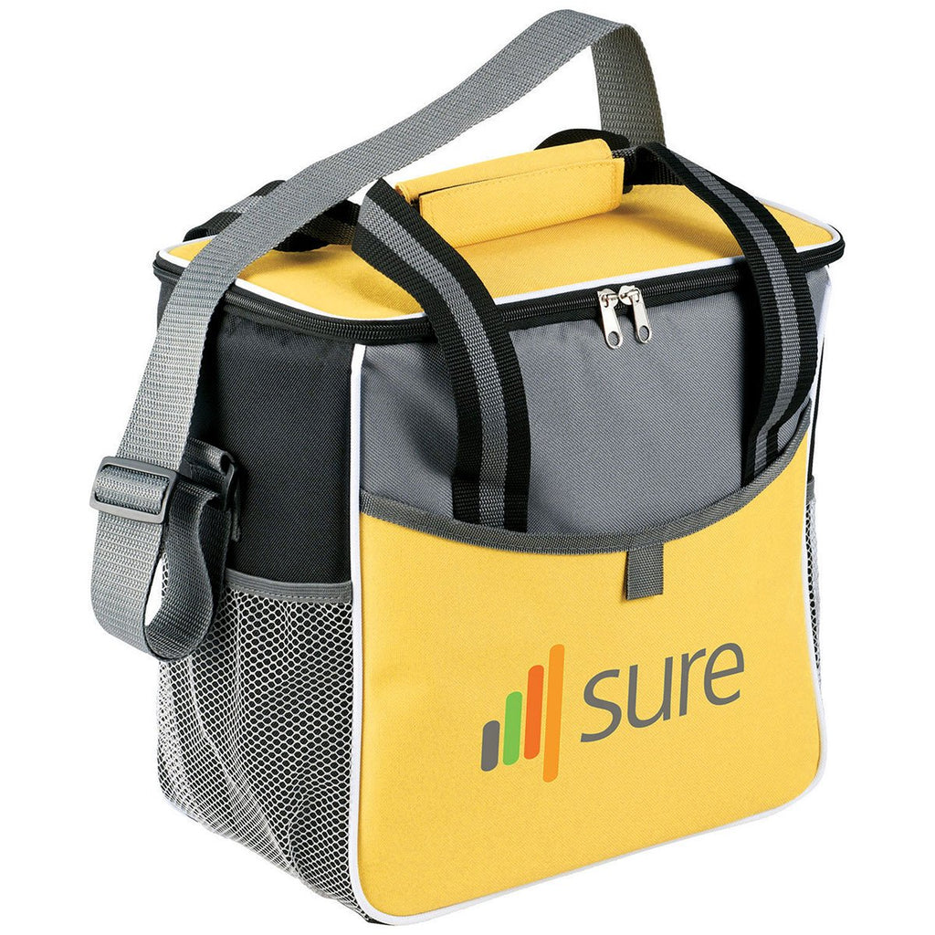The Bullet Yellow Hero 6-Can Event Cooler is a handy way to promote your corporate brand. The open front pocket comes with a choice of four colors to contrast the gray body, helping your custom logo stand out. You could hand out these logoed bags as employee gifts to give your company name some exposure.The minimum order for this product is 25 pieces.