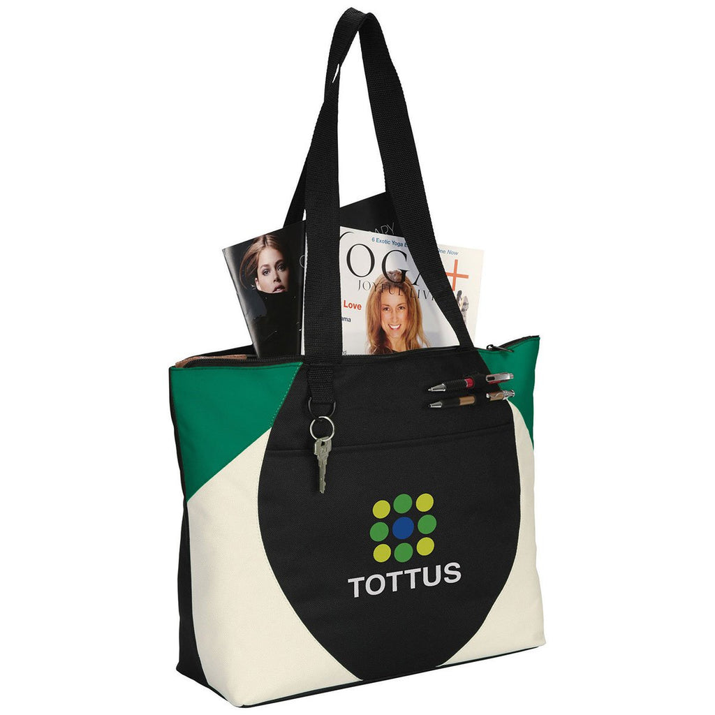 The Bullet Black with Green Trim Asher Zippered Convention Tote is perfectly designed to highlight your corporate logo. Available in two- or three-color patterns, your logo can stand out on the front and promote your company name at trade shows. This logoed bag can be re-used for shopping, which will get more eyes on your brand. The minimum order for this product is 48 pieces.Highlights