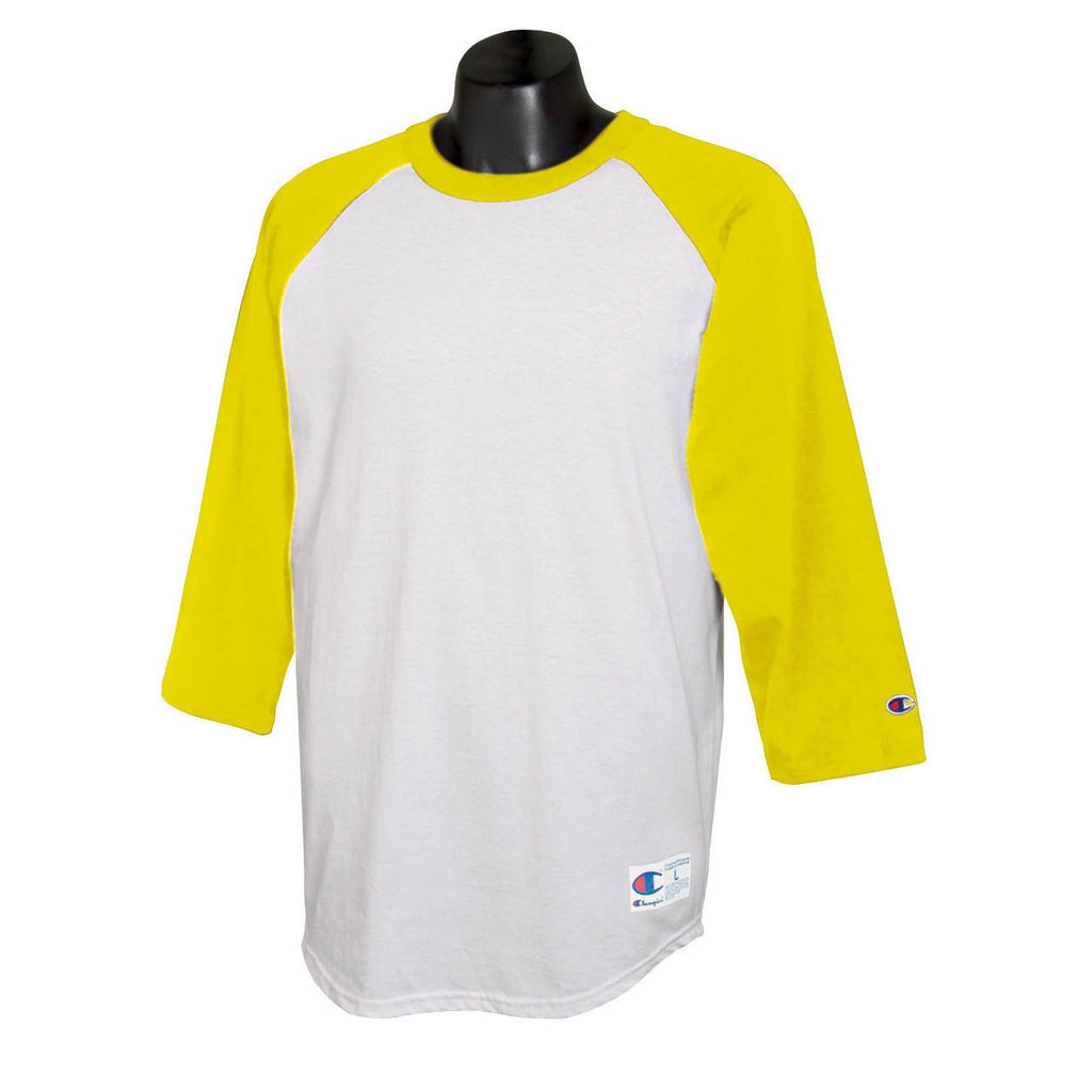 Want a T-shirt that will never go out of style? The classic design of the Champion Men's White/Gold Baseball T-Shirt is comfortable and durable enough to wear all the time--and casual enough that you just might get away with doing exactly that. The Champion Men's White/Gold Baseball T-Shirt is extremely lightweight and breathable.?Made with 100% cotton, it has 3/4 length sleeves, double-needle stitching on the sleeves and bottom hem, and a logo on the left sleeve.Highlights