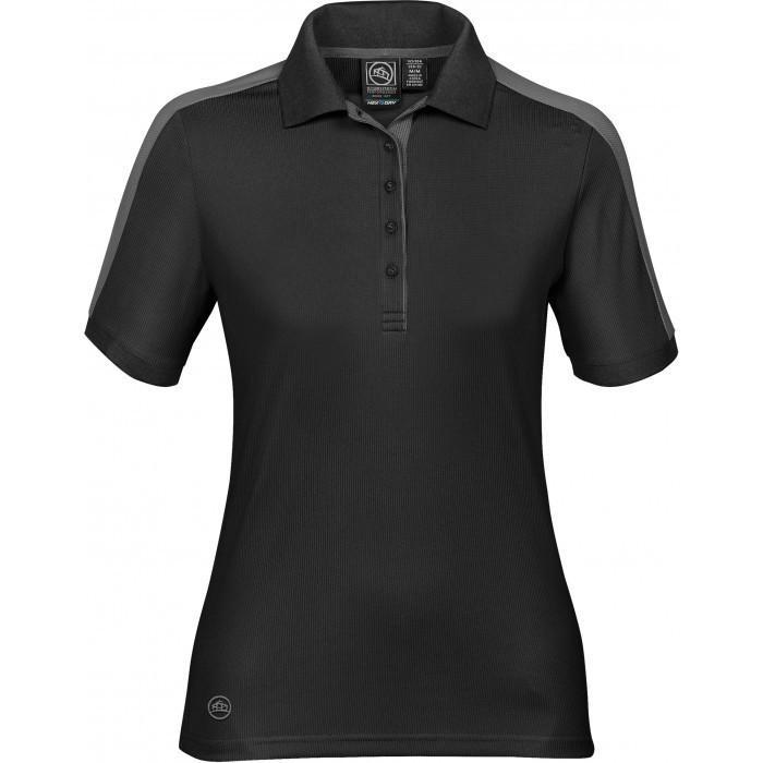 The Stormtech Women's Black/Granite Shadow Polo isn't just a sporty shirt. It is a two-tone, eye-catching top with tons of style. Mechanical stretch ensures a comfortable, but modern fit and moisture-wicking materials keeps wearers dry even after long periods of wear. Add your company name or team logo and make it your next uniform or corporate giveaway item.Corresponding Men's Style: Stormtech Men's Black/Granite Shadow Polo
