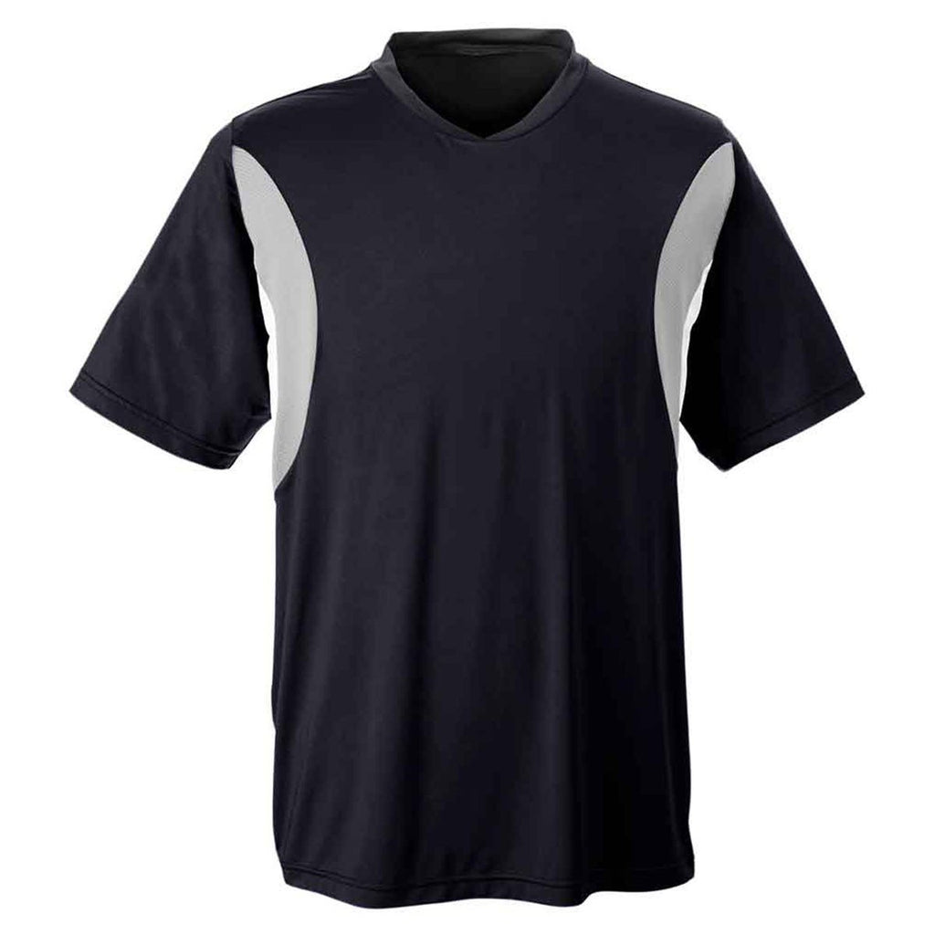 Whether you play in soccer league or just need a jersey to participate in a basketball pick-up game, the Team 365 Men's Black Short-Sleeve Athletic V-Neck Tournament Jersey is the right jersey for you. The mostly polyester jersey includes enough spandex to give you the movement flexibility you need to out maneuver the competition. Cationic dyes produce a superior bright design that attracts the attention of everyone who attends the big game. Take advantage of the attention by adding a custom logo that potential customers remember. Moisture wicking technology quickly removes perspiration to cool the skin.