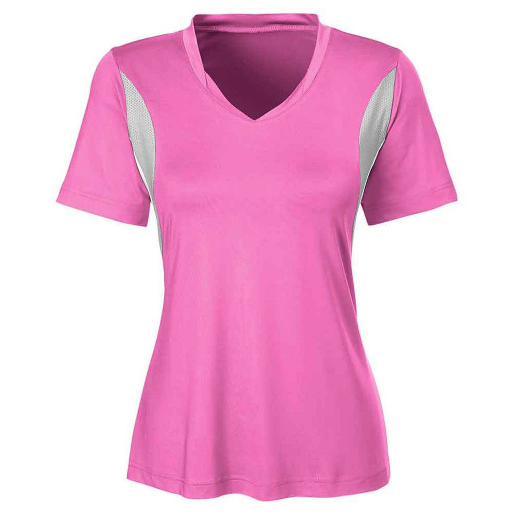 Cationic dyes create a stunning appearance for the Team 365 Women's Sport Charity Pink Short-Sleeve Athletic V-Neck Tournament Jersey. The bright dyes create superior color fastness to get you noticed on the field, as well as at the gym. Take advantage of the attention by attaching your company logo to the large imprint area. Moisture wicking technology keeps you skin cool and antimicrobial properties ensure you look fresh throughout your hectic day. The 91% polyester sports jersey includes enough spandex to offer you superior mobility. Double-needle stitching at the hems ensures long lasting durability.Highlights