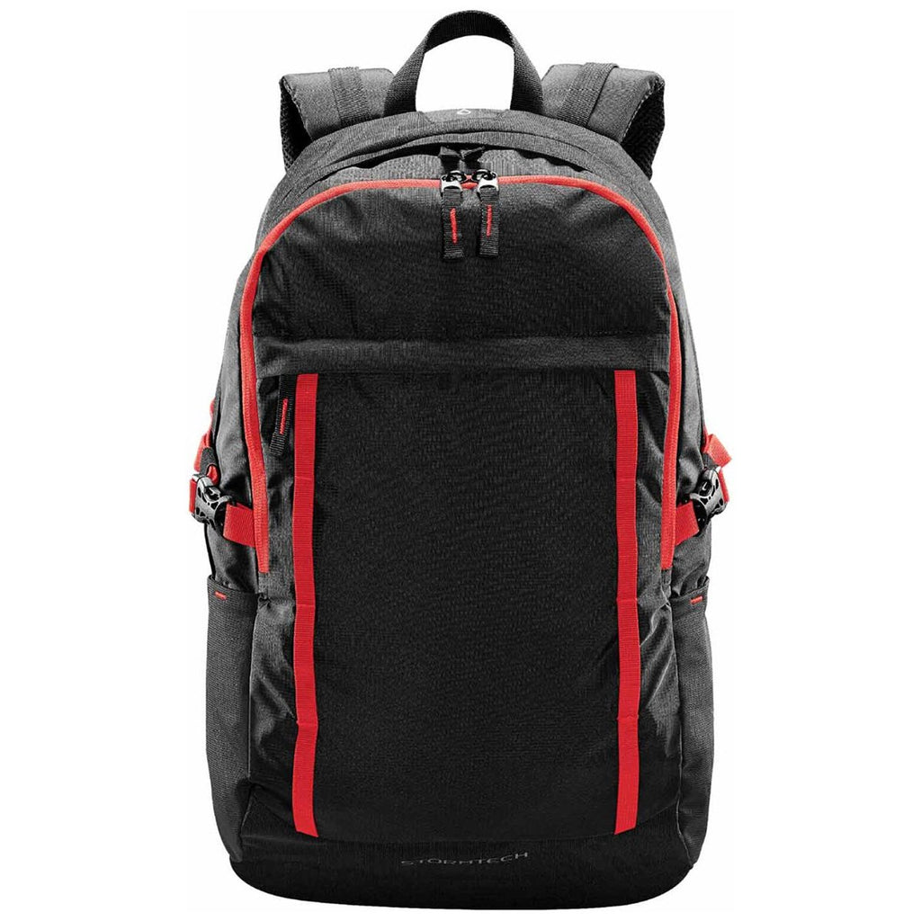 The custom Stormtech Black/Red Sequoia Day Pack will allow you to stay prepared no matter what the day throws your way. This mid-sized pack can be custom embroidered with your company logo or design to offer as corporate gifts or as prizes for the next company outing. If your employees must travel then make this part of employee apparel to store important documents and materials. The 30L day pack is lightweight with ergonomic padded shoulder and waist straps for comfort with front zipper pocket complete with RFID blocking to detour cyber crime. A large inner compartment and open side pockets mean plenty of room for whatever you need. Choose your favorite color combination and order today.Highlights